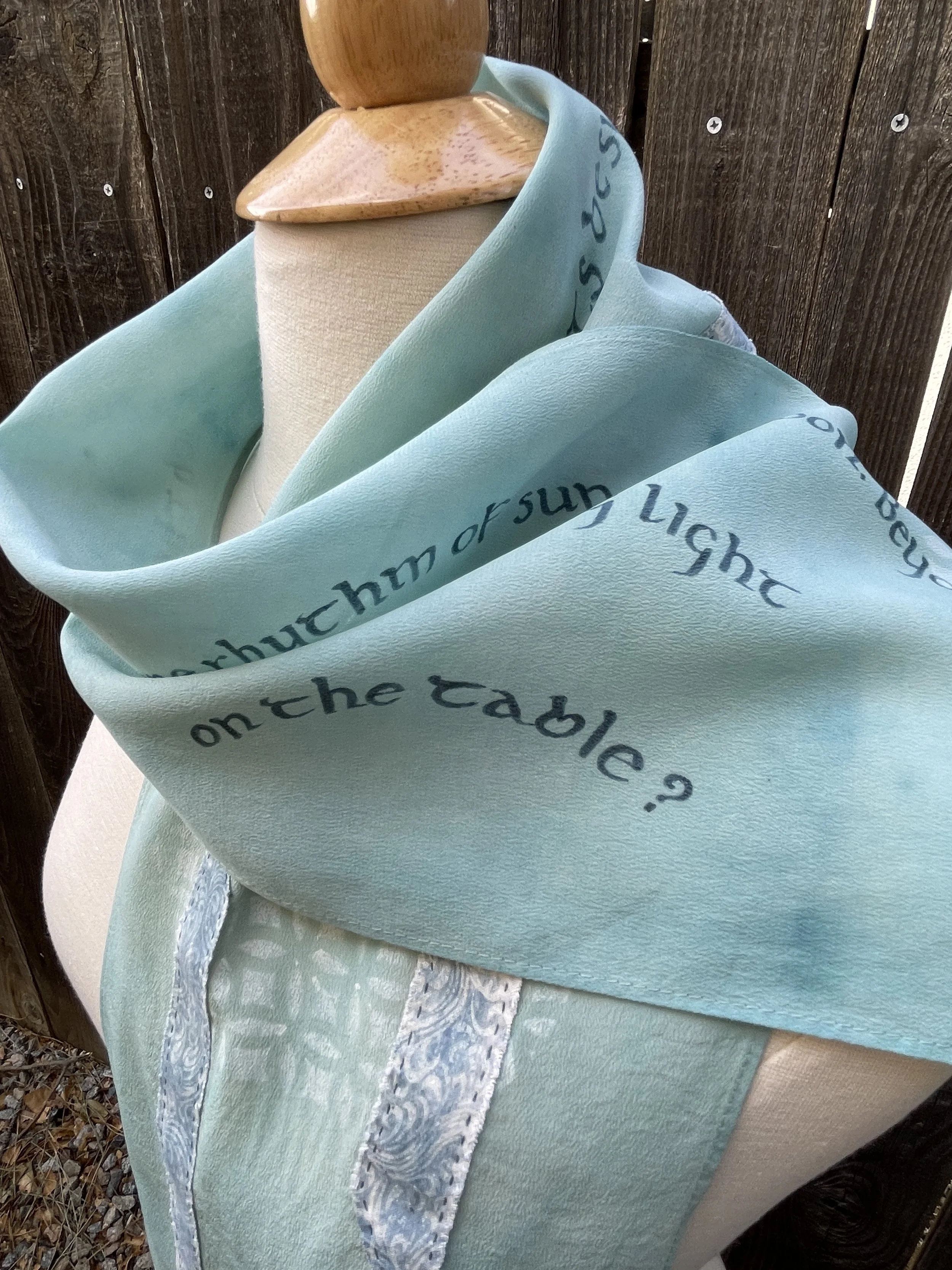 Backround dyed with fresh indigo leaves (Persicaria tinctoria). Text painted with indigo ink combined with soy milk binder.